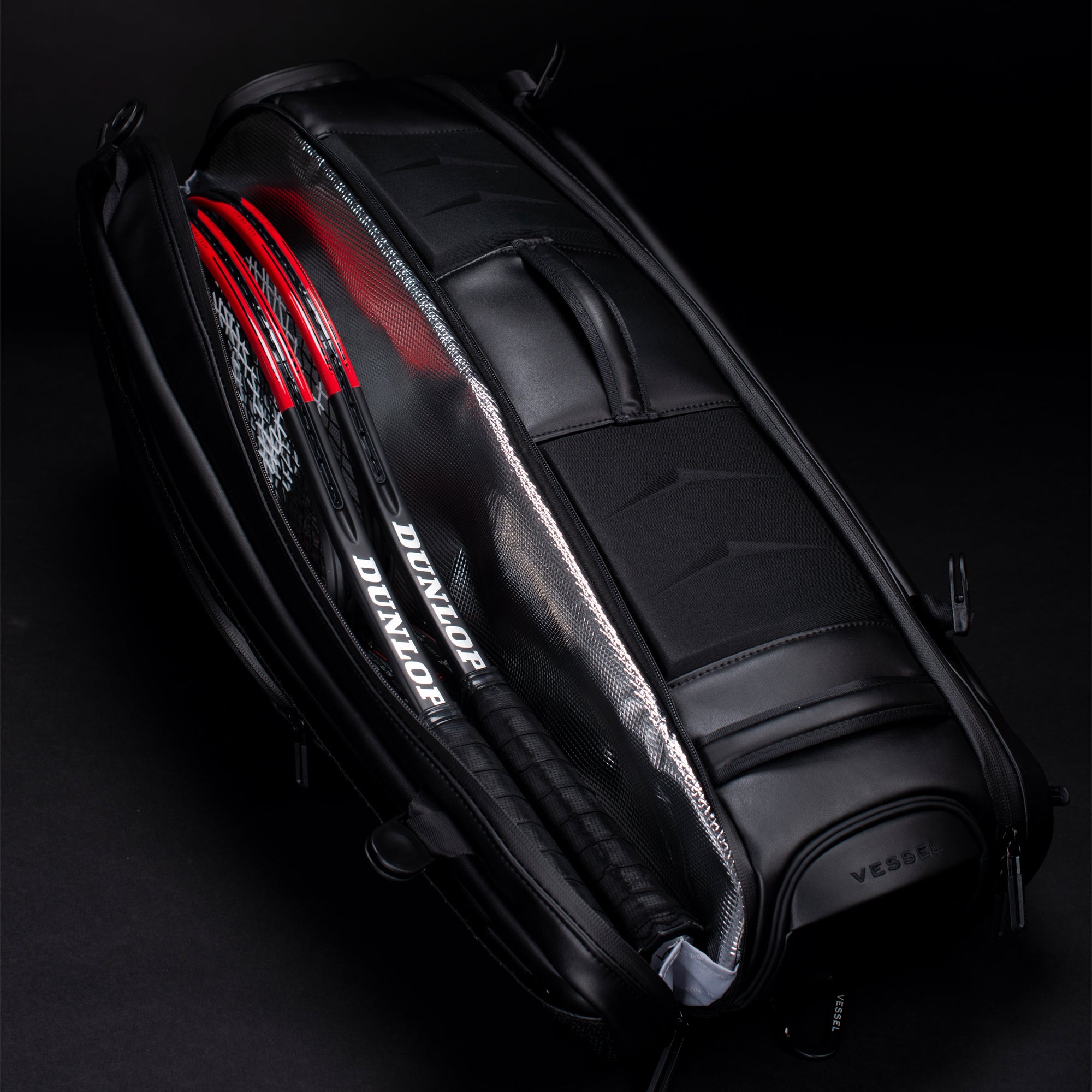 In addition to 2 garment compartments and internal pockets throughout,  this racquet bag also features a dedicated accessories compartment with internal organization: a microfiber lined valuables pocket, 2 mesh slip pockets, an additional zip pocket & a key-clip