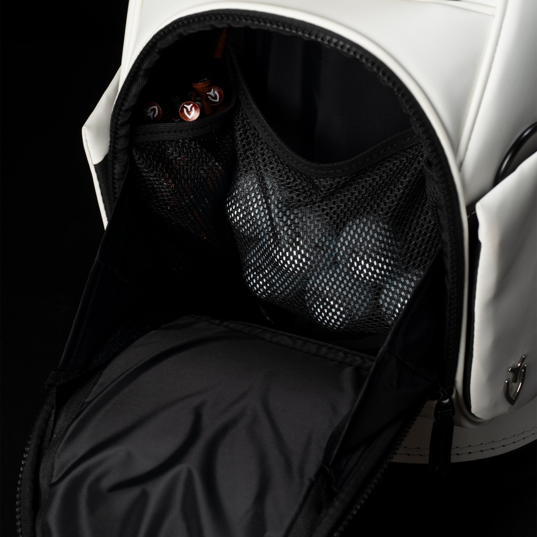Professional golf bags need to withstand the rigors of constant play and occasional travel so the VESSEL Prime Mini Staff bag features a 5-way top with structural steel ring. This meticulously-designed top is wrapped in luxurious microsuede and features 2 horizontal dividers to ensure that all golfing gear, clubs, and shafts are protected.